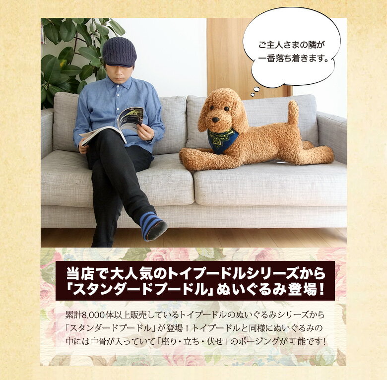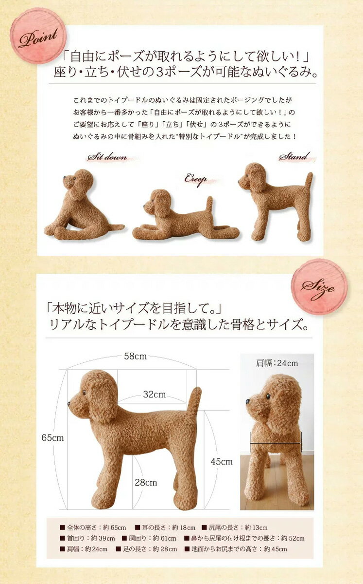 ギフト対応 商品情報 サイズ ■全体の高さ:約58cm ■耳の長さ:約18cm■尻尾の長さ:約13cm ■肩幅:約24cm ■首回り:約39cm ■胴回り:約61cm ■首から尻尾の付け根までの長さ:約32cm ■鼻から尻尾の付け根までの長さ:約52cm 特徴 ■リアルな犬のぬいぐるみシリーズから「スタンダードプードル(アプリコットver.)のぬいぐるみ」が登場♪