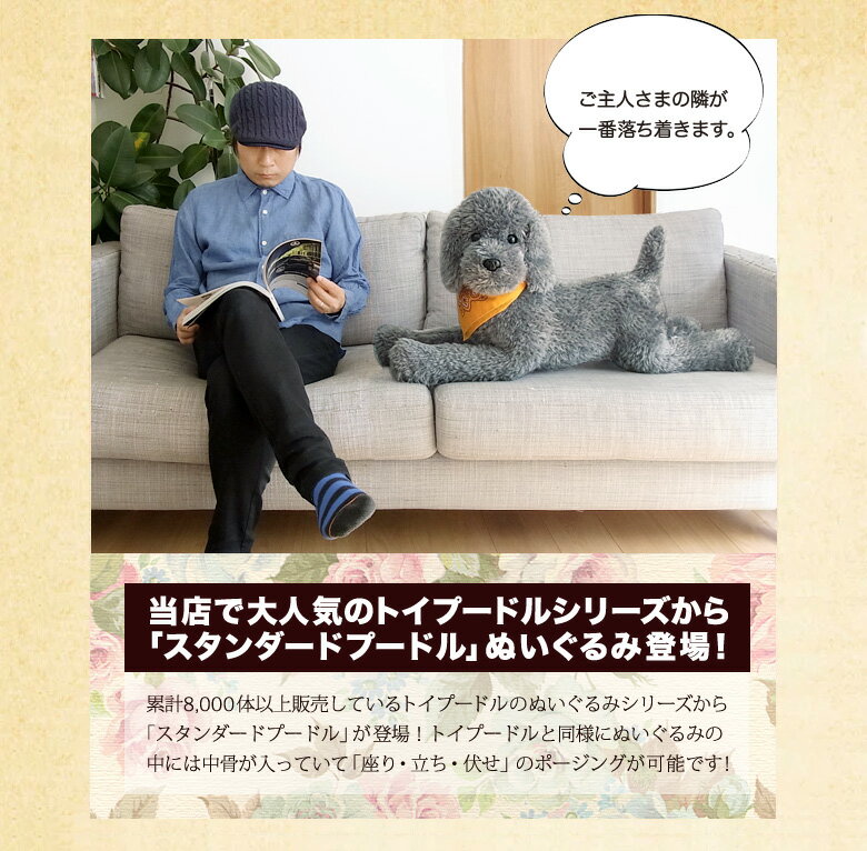 ギフト対応 商品情報 サイズ ■全体の高さ:約58cm ■耳の長さ:約18cm■尻尾の長さ:約13cm ■肩幅:約24cm ■首回り:約39cm ■胴回り:約61cm ■首から尻尾の付け根までの長さ:約32cm ■鼻から尻尾の付け根までの長さ:約52cm 特徴 ■リアルな犬のぬいぐるみシリーズから「スタンダードプードル(シルバーver.)のぬいぐるみ」が登場♪