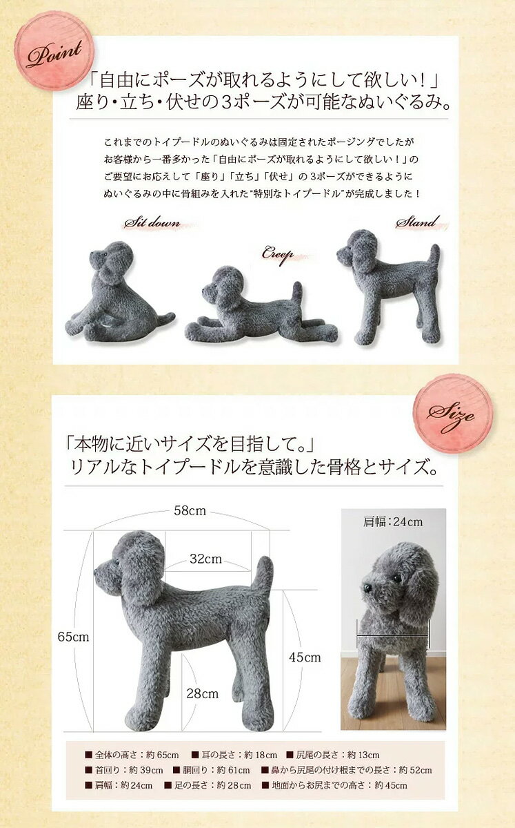 皆様から頂いたご要望にお応えして骨組みを加えて「立ち」「座り」「伏せ」のポーズが可能に! とっても愛らしいスタンダードプードルのぬいぐるみです♪
